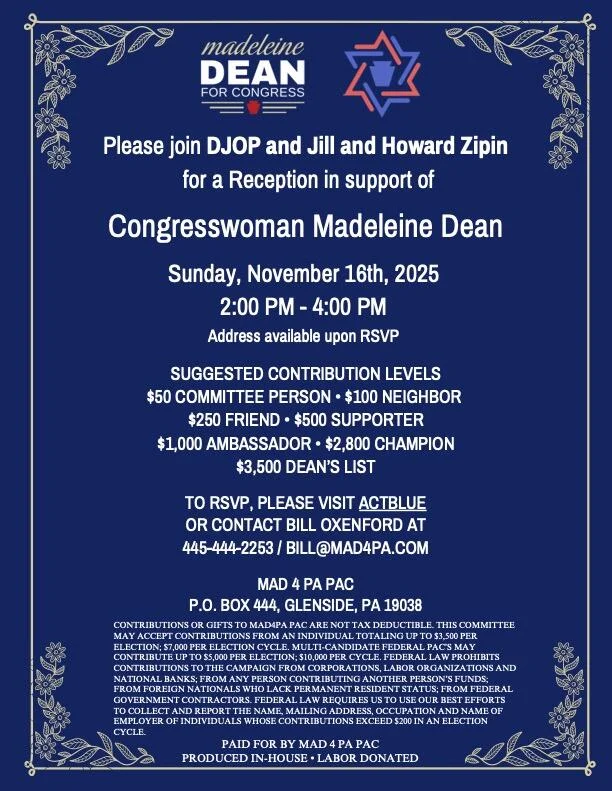 Please join DJOP and Jill and Howard Zipin for a Reception in support of Congresswoman Madeleine Dean on Sunday, November 16th, 2025 from 2:00 PM – 4:00 PM.