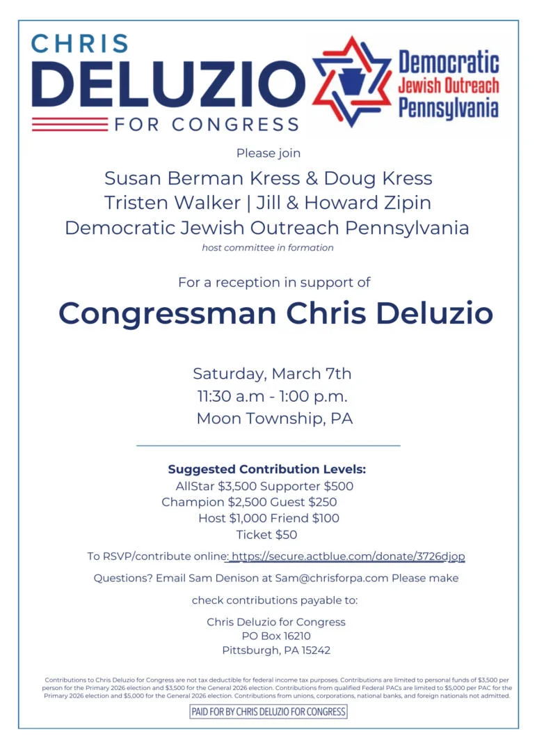 Please join DJOP and a host committee in formation for a reception in support of Congressman Chris Deluzio on Saturday March 7, 2026 from 11:30 am to 1:00 pm in Moon Township.
